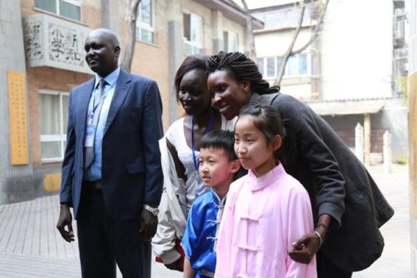 圖為三位南蘇丹教育工作者在參觀西安新知小學期間與在校學生合影(拍攝于2017年4月6日,中南傳媒提供)