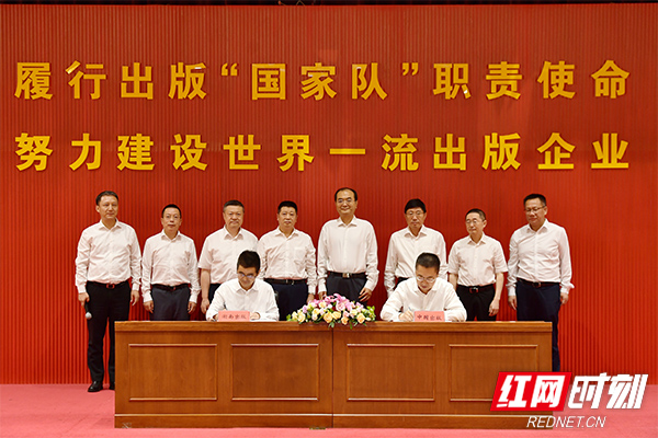 中國出版集團(tuán)黨組成員、副總經(jīng)理陳永剛,中國出版集團(tuán)黨組成員、中國出版?zhèn)髅焦煞萦邢薰靖笨偨?jīng)理茅院生,湖南出版集團(tuán)黨委書記、董事長彭玻,湖南出版集團(tuán)黨委副書記、副董事長、總編輯、總經(jīng)理楊壯,湖南出版集團(tuán)黨委委員、分管日常工作的副總經(jīng)理舒斌出席簽約協(xié)議。